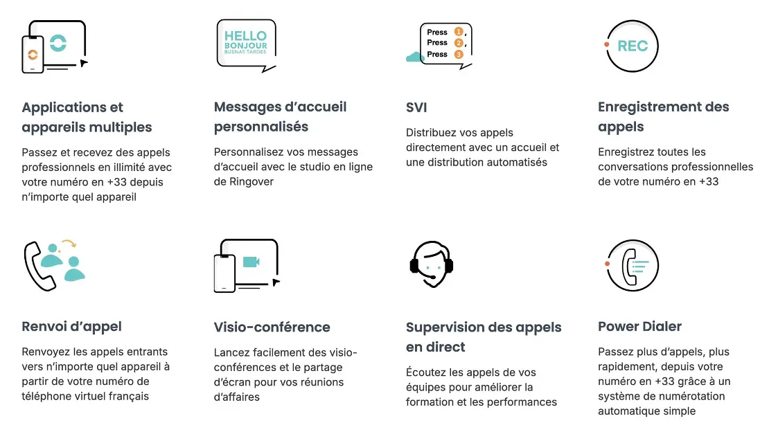 | Menu vocal (“appuyez sur 1, 2…”) | Permet aux appelants de choisir un numéro pour accéder au bon service/personne. En savoir plus | Plans Business et Advanced. support.ringover.com+3support.ringover.com+3CloudTalk+3 |